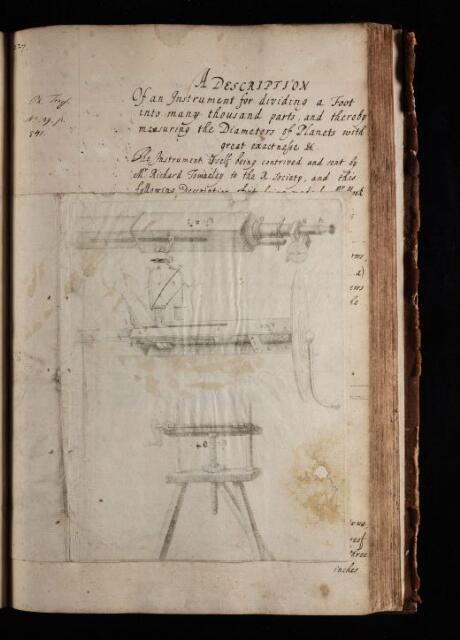 'The instrument itself being contrived by Mr Richard Towneley to the Royal Society and this following Description of it being made by Mr Hook was read before the Society'