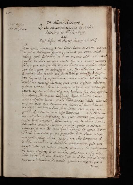 An exact narrative of an hermaphrodite now in London. - This was communicated by the ingenious Dr. Tho. Allen (now a Fellow of the R. Society) to a friend of his in a Latin letter, in which as it was imparted to the said society, so it was thought fit to publish it here for the view of the learned; v External link, opens in new tab.