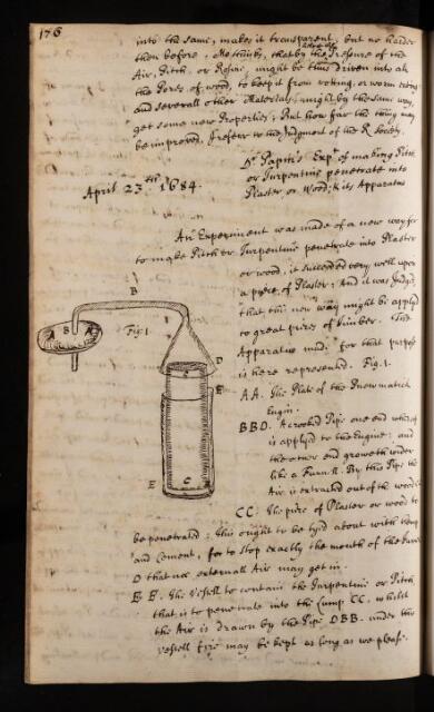 Dr Papin's experiment of making Pitch or Turpentine penetrate into Plaster or Wood, 23 April 1684, RBO/6/24, The Royal Society Archives, London, https://makingscience.royalsociety.org/items/rbo_6_24/dr-papins-experiment-of-making-pitch-or-turpentine-penetrate-into-plaster-or-wood, accessed on 22 January 2026