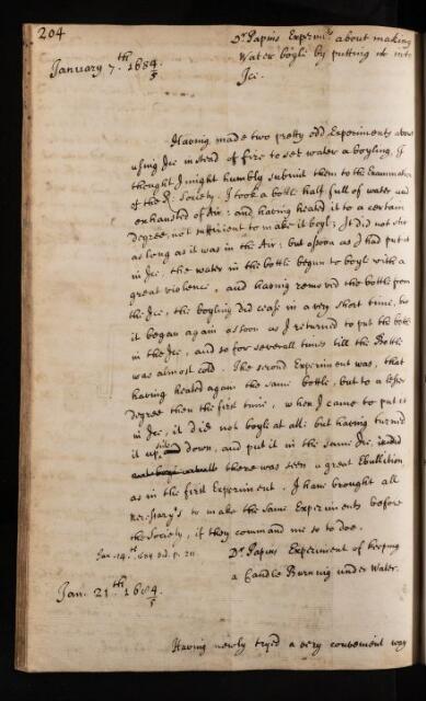 'Dr Papin's Experiments about making Water boyle by putting it into Ice', 7 January 1685, RBO/6/48, The Royal Society Archives, London, https://makingscience.royalsociety.org/items/rbo_6_48/dr-papins-experiments-about-making-water-boyle-by-putting-it-into-ice, accessed on 14 December 2025