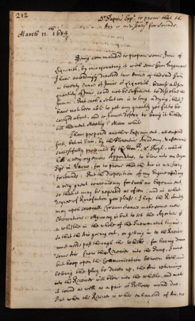 'Dr Papin's Experiment to prove that the Air is necessary for Sounds', 11 March 1685, RBO/6/56, The Royal Society Archives, London, https://makingscience.royalsociety.org/items/rbo_6_56/dr-papins-experiment-to-prove-that-the-air-is-necessary-for-sounds, accessed on 13 December 2025