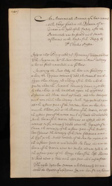'An Anatomicall Account of Some remarkable things found on the Dissection of a Woman who dyed of the Dropsy' by Charles Preston