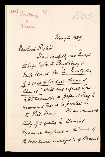 Thomas Edward Thorpe, Referee's report by Thomas Edward Thorpe, on a paper 'An investigation of a case of gradual chemical change' by W H Pendlebury and Margaret Seward, 05 January 1889, RR/10/205, The Royal Society Archives, London, https://makingscience.royalsociety.org/items/rr_10_205/referees-report-by-thomas-edward-thorpe-on-a-paper-an-investigation-of-a-case-of-gradual-chemical-change-by-w-h-pendlebury-and-margaret-seward, accessed on 13 February 2026