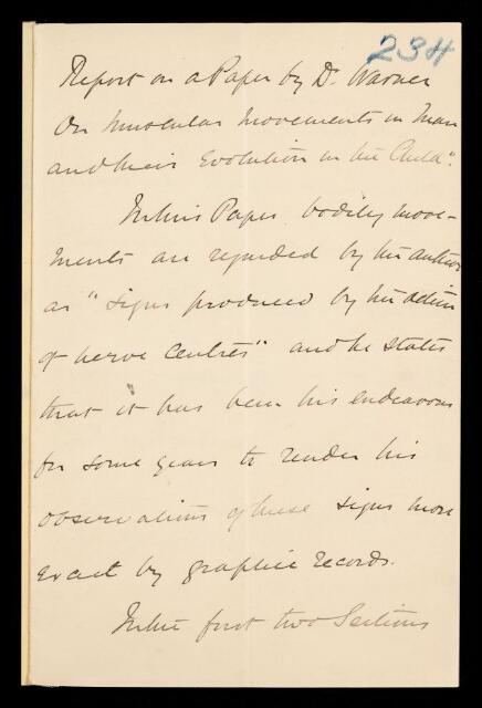John Scott Burdon-Sanderson, Referee's report by John Scott Burdon-Sanderson, on a paper 'Muscular movements in man, and their evolution in the infant: a study of movement in man, and its evolution, together with inferences as to the properties of nervecentres and their modes of action in expressing thought' by Francis Warner, 14 August 1888, RR/10/234, The Royal Society Archives, London, https://makingscience.royalsociety.org/items/rr_10_234/referees-report-by-john-scott-burdon-sanderson-on-a-paper-muscular-movements-in-man-and-their-evolution-in-the-infant-a-study-of-movement-in-man-and-its-evolution-together-with-inferences-as-to-the-properties-of-nervecentres-and-their-modes-of-action-in-expressing-thought-by-francis-warner, accessed on 21 January 2026