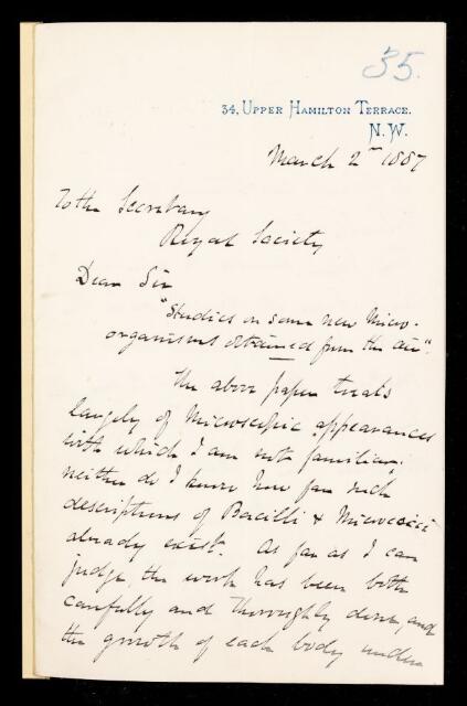 William James Russell, Referee's report by William James Russell, on a paper 'Studies on some new micro-organisms obtained from air' by Percy Faraday Frankland, 02 March 1887, RR/10/35, The Royal Society Archives, London, https://makingscience.royalsociety.org/items/rr_10_35/referees-report-by-william-james-russell-on-a-paper-studies-on-some-new-micro-organisms-obtained-from-air-by-percy-faraday-frankland, accessed on 14 January 2026