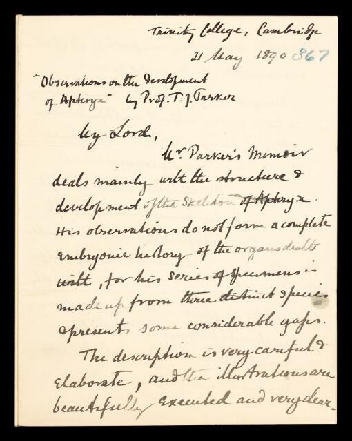 Adam Sedgwick, Referee's report by Adam Sedgwick, on a paper 'Observation on the anatomy and development of Apteryx' by Thomas Jeffery Parker, 21 May 1890, RR/10/367, The Royal Society Archives, London, https://makingscience.royalsociety.org/items/rr_10_367/referees-report-by-adam-sedgwick-on-a-paper-observation-on-the-anatomy-and-development-of-apteryx-by-thomas-jeffery-parker, accessed on 11 November 2025
