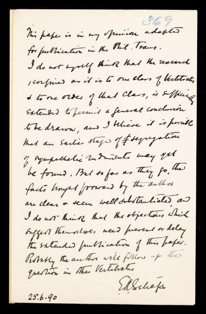 Edward Albert Sharpey-Schafer, Referee's report by Edward Albert Sharpey-Schafer, on a paper 'Development of the sympathetic nervous system mammals' by A M Paterson, 25 June 1890, RR/10/369, The Royal Society Archives, London, https://makingscience.royalsociety.org/items/rr_10_369/referees-report-by-edward-albert-sharpey-schafer-on-a-paper-development-of-the-sympathetic-nervous-system-mammals-by-a-m-paterson, accessed on 09 March 2026