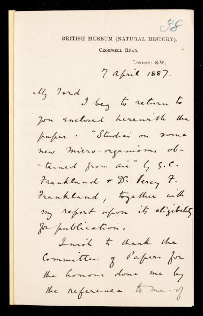 George Robert Milne Murray, Letter from George Robert Milne Murray, to John William Strutt, 3rd Baron Rayleigh, regarding a paper 'Studies on some new micro-organisms obtained from air' by Percy Faraday Frankland, 07 April 1887, RR/10/38, The Royal Society Archives, London, https://makingscience.royalsociety.org/items/rr_10_38/letter-from-george-robert-milne-murray-to-john-william-strutt-3rd-baron-rayleigh-regarding-a-paper-studies-on-some-new-micro-organisms-obtained-from-air-by-percy-faraday-frankland, accessed on 09 February 2026