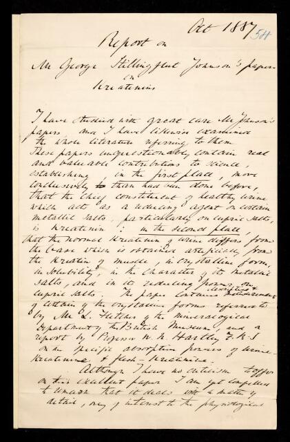 Arthur Gamgee, Referee's report by Arthur Gamgee, on a paper 'On kreatinins. I. On the kreatinin of urine as distinguished from that obtained from flesh kreatin. II. On the kreatinins derived from the dehydration of urinary kreatin' by George Stillingfleet Johnson, October 1887, RR/10/54, The Royal Society Archives, London, https://makingscience.royalsociety.org/items/rr_10_54/referees-report-by-arthur-gamgee-on-a-paper-on-kreatinins-i-on-the-kreatinin-of-urine-as-distinguished-from-that-obtained-from-flesh-kreatin-ii-on-the-kreatinins-derived-from-the-dehydration-of-urinary-kreatin-by-george-stillingfleet-johnson, accessed on 13 February 2026