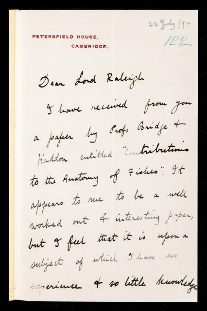 Walter Holbrook Gaskell, Referee's report by Walter Holbrook Gaskell, on a paper 'Contributions to the anatomy of fishes. II. The air-bladder and Weberian ossicles in the siluroid fishes' by Thomas William Bridge and Alfred Cort Haddon, 22 July 1892, RR/11/122, The Royal Society Archives, London, https://makingscience.royalsociety.org/items/rr_11_122/referees-report-by-walter-holbrook-gaskell-on-a-paper-contributions-to-the-anatomy-of-fishes-ii-the-air-bladder-and-weberian-ossicles-in-the-siluroid-fishes-by-thomas-william-bridge-and-alfred-cort-haddon, accessed on 10 November 2025