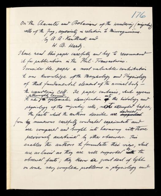 Edward Emanuel Klein, Referee's report by Edward Emanuel Klein, on a paper 'On the characters and behaviour of the wandering (migrating) cells of the frog, especially in relation to micro-organisms' by A A Kanthack and William Bate Hardy, 1892, RR/11/176, The Royal Society Archives, London, https://makingscience.royalsociety.org/items/rr_11_176/referees-report-by-edward-emanuel-klein-on-a-paper-on-the-characters-and-behaviour-of-the-wandering-migrating-cells-of-the-frog-especially-in-relation-to-micro-organisms-by-a-a-kanthack-and-william-bate-hardy, accessed on 17 February 2026