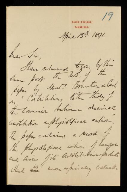 Arthur Sheridan Lea, Referee's report by Arthur Sheridan Lea, on a paper 'Contributions to the study of the connection between chemical constitution and physiological action.—Part II' by Thomas Lauder Brunton and John Theodore Cash, 13 April 1891, RR/11/19, The Royal Society Archives, London, https://makingscience.royalsociety.org/items/rr_11_19/referees-report-by-arthur-sheridan-lea-on-a-paper-contributions-to-the-study-of-the-connection-between-chemical-constitution-and-physiological-actionpart-ii-by-thomas-lauder-brunton-and-john-theodore-cash, accessed on 15 March 2026