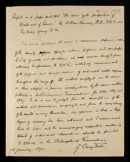 George Carey Foster, Referee's report by George Carey Foster, on a paper 'On some of the properties of water and of steam' by William Ramsay and Sydney Young, 09 January 1892, RR/11/199, The Royal Society Archives, London, https://makingscience.royalsociety.org/items/rr_11_199/referees-report-by-george-carey-foster-on-a-paper-on-some-of-the-properties-of-water-and-of-steam-by-william-ramsay-and-sydney-young, accessed on 21 January 2026