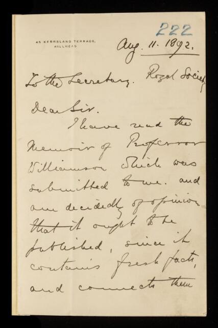 Frederick Orpen Bower, Referee's report by Frederick Orpen Bower on a paper 'On the organization of the fossil plants of the coal-measures. Part XIX' by William Crawford Williamson, 11 August 1892, RR/11/222, The Royal Society Archives, London, https://makingscience.royalsociety.org/items/rr_11_222/referees-report-by-frederick-orpen-bower-on-a-paper-on-the-organization-of-the-fossil-plants-of-the-coal-measures-part-xix-by-william-crawford-williamson, accessed on 14 March 2026