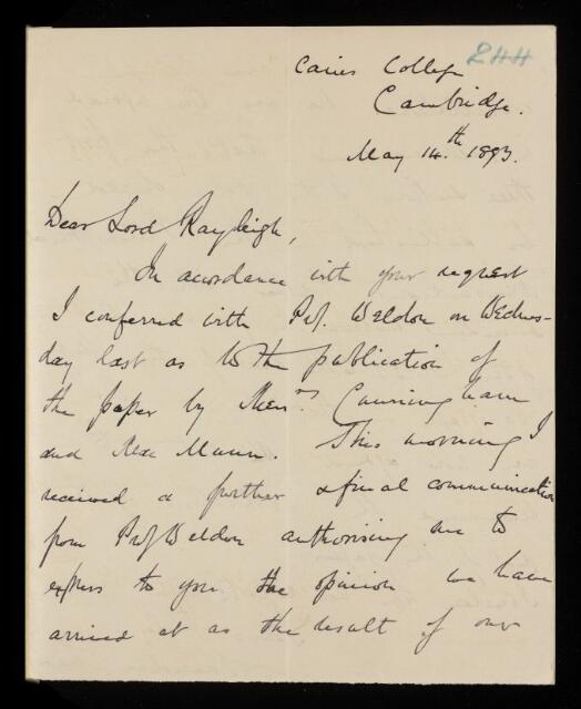 Arthur Sheridan Lea, Letter from Arthur Sheridan Lea, on a paper 'On the coloration of the skins of fishes, especially of pleuronectidae' by J T Cunningham and C A MacMunn to the Secretary of the Royal Society, 14 May 1893, RR/11/244, The Royal Society Archives, London, https://makingscience.royalsociety.org/items/rr_11_244/letter-from-arthur-sheridan-lea-on-a-paper-on-the-coloration-of-the-skins-of-fishes-especially-of-pleuronectidae-by-j-t-cunningham-and-c-a-macmunn-to-the-secretary-of-the-royal-society, accessed on 15 April 2026