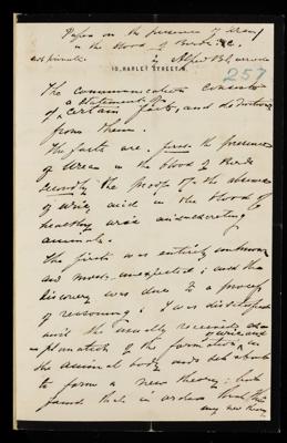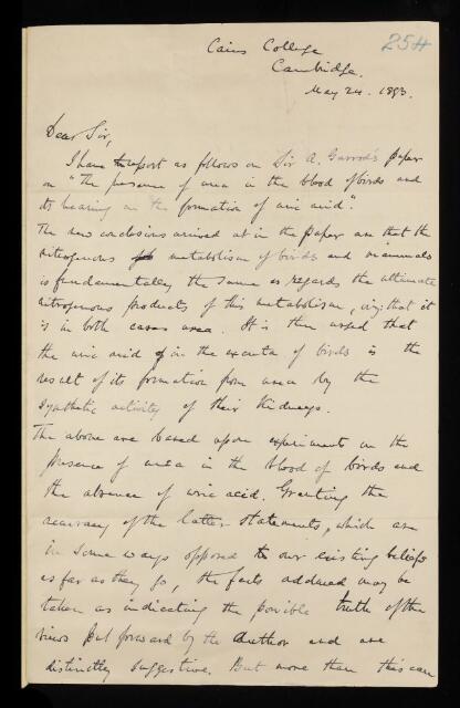 Arthur Sheridan Lea, Referee's report by Arthur Sheridan Lea, on a paper 'On the presence of urea in the blood of birds, and its bearing upon the formation of uric acid in the animal body' by Alfred Baring Garrod, 24 May 1893, RR/11/254, The Royal Society Archives, London, https://makingscience.royalsociety.org/items/rr_11_254/referees-report-by-arthur-sheridan-lea-on-a-paper-on-the-presence-of-urea-in-the-blood-of-birds-and-its-bearing-upon-the-formation-of-uric-acid-in-the-animal-body-by-alfred-baring-garrod, accessed on 09 February 2026