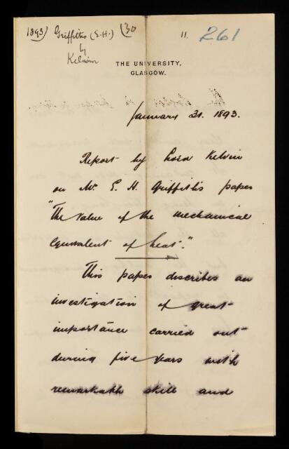 William Thomson, Referee's report by William Thomson, Lord Kelvin, on a paper 'The value of the mechanical equivalent of heat, deduced from some experiments performed with the view of establishing the relation between the electrical and mechanical units; together with an investigation into the capacity for heat of water at different temperatures' by Ernest Howard Griffiths, 31 January 1893, RR/11/261, The Royal Society Archives, London, https://makingscience.royalsociety.org/items/rr_11_261/referees-report-by-william-thomson-lord-kelvin-on-a-paper-the-value-of-the-mechanical-equivalent-of-heat-deduced-from-some-experiments-performed-with-the-view-of-establishing-the-relation-between-the-electrical-and-mechanical-units-together-with-an-investigation-into-the-capacity-for-heat-of-water-at-different-temperatures-by-ernest-howard-griffiths, accessed on 12 November 2025