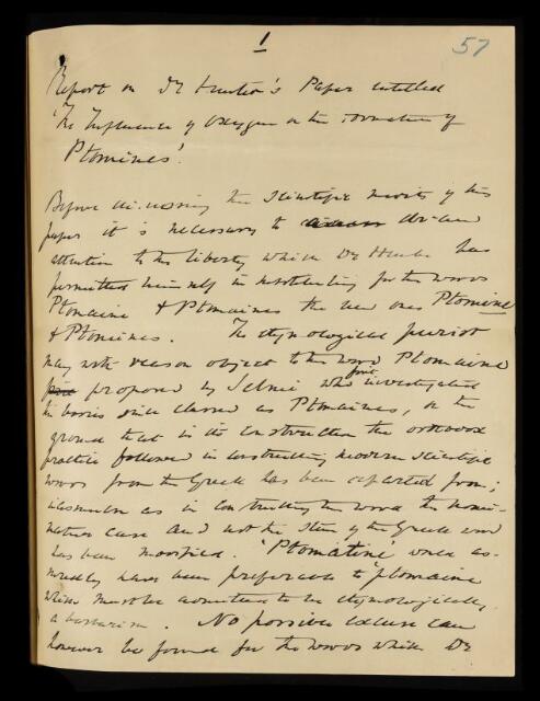 Arthur Gamgee, Referee's report by Arthur Gamgee, on a paper 'The influence of oxygen on the formation of ptomaines' by William Hunter, 03 June 1891, RR/11/57, The Royal Society Archives, London, https://makingscience.royalsociety.org/items/rr_11_57/referees-report-by-arthur-gamgee-on-a-paper-the-influence-of-oxygen-on-the-formation-of-ptomaines-by-william-hunter, accessed on 21 April 2026