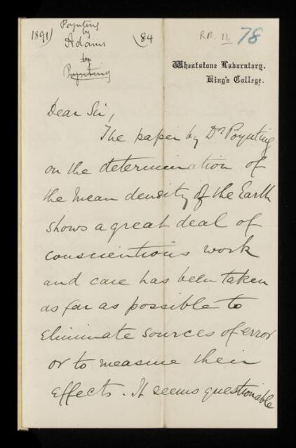 William Grylls Adams, Referee's report by William Grylls Adams, on a paper 'On a determination of the mean density of the Earth and the gravitation constant by means of the common balance' by John Henry Poynting, 1891, RR/11/78, The Royal Society Archives, London, https://makingscience.royalsociety.org/items/rr_11_78/referees-report-by-william-grylls-adams-on-a-paper-on-a-determination-of-the-mean-density-of-the-earth-and-the-gravitation-constant-by-means-of-the-common-balance-by-john-henry-poynting, accessed on 09 December 2025