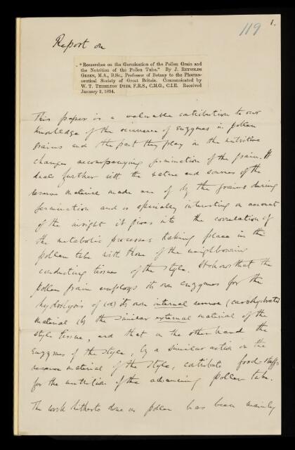 Arthur Sheridan Lea, Referee's report by Arthur Sheridan Lea, on a paper 'Researches on the germination of the pollen grain and the nutrition of the pollen tube' by Joseph Reynolds Green, 18 February 1894, RR/12/119, The Royal Society Archives, London, https://makingscience.royalsociety.org/items/rr_12_119/referees-report-by-arthur-sheridan-lea-on-a-paper-researches-on-the-germination-of-the-pollen-grain-and-the-nutrition-of-the-pollen-tube-by-joseph-reynolds-green, accessed on 13 January 2026