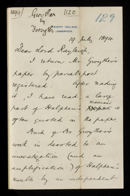 Letter from Andrew Russell Forsyth, to John William Strutt, 3rd Baron Rayleigh, regarding a paper 'The differential covariants of twisted curves, with some illustrations of the application to quartic curves' by R F Gwyther