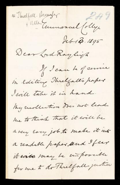 William Napier Shaw, Letter from William Napier Shaw, to John William Strutt, 3rd Baron Rayleigh, regarding a paper 'Researches on the electric properties of pure substances.—No. I. The electrical properties of pure sulphur' by Richard Threlfall, Joseph Henry Drapier Brearley and Mr Allen, 13 February 1895, RR/12/249, The Royal Society Archives, London, https://makingscience.royalsociety.org/items/rr_12_249/letter-from-william-napier-shaw-to-john-william-strutt-3rd-baron-rayleigh-regarding-a-paper-researches-on-the-electric-properties-of-pure-substancesno-i-the-electrical-properties-of-pure-sulphur-by-richard-threlfall-joseph-henry-drapier-brearley-and-mr-allen, accessed on 11 February 2026