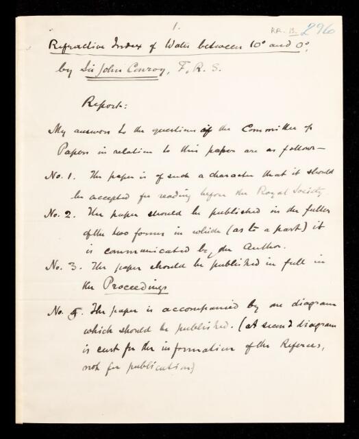 George Carey Foster, Referee's report by George Carey Foster, on a paper 'On the refractive index of water at temperatures between 0° and 10°' by John Conroy, 20 June 1895, RR/12/296, The Royal Society Archives, London, https://makingscience.royalsociety.org/items/rr_12_296/referees-report-by-george-carey-foster-on-a-paper-on-the-refractive-index-of-water-at-temperatures-between-0-and-10-by-john-conroy, accessed on 17 November 2025