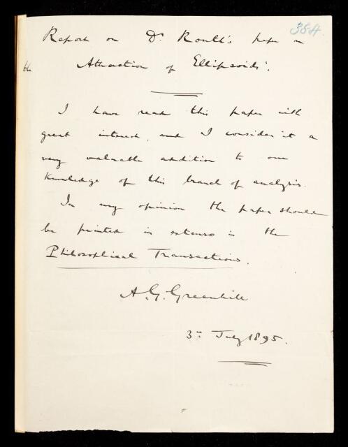 Alfred George Greenhill, Referee's report by Alfred George Greenhill, on a paper 'Theorems on the attraction of ellipsoids for certain laws of force other than the inverse square' by Edward John Routh, 03 July 1895, RR/12/384, The Royal Society Archives, London, https://makingscience.royalsociety.org/items/rr_12_384/referees-report-by-alfred-george-greenhill-on-a-paper-theorems-on-the-attraction-of-ellipsoids-for-certain-laws-of-force-other-than-the-inverse-square-by-edward-john-routh, accessed on 18 January 2026