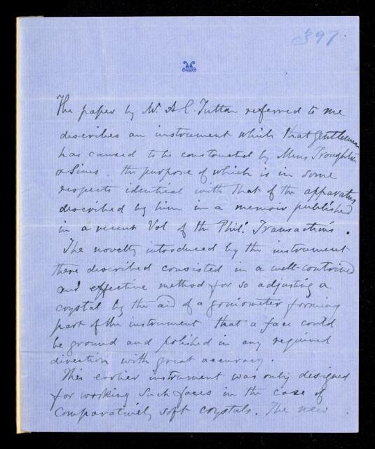 Mervyn Herbert Nevil Story-Maskelyne, Referee's report by Mervyn Herbert Nevil Story Maskelyne, on a paper 'An instrument for cutting, grinding, and polishing section-plates and prisms of mineral or other crystals accurately in the desired directions' by Alfred Edwin Howard Tutton, 28 December 1894, RR/12/397, The Royal Society Archives, London, https://makingscience.royalsociety.org/items/rr_12_397/referees-report-by-mervyn-herbert-nevil-story-maskelyne-on-a-paper-an-instrument-for-cutting-grinding-and-polishing-section-plates-and-prisms-of-mineral-or-other-crystals-accurately-in-the-desired-directions-by-alfred-edwin-howard-tutton, accessed on 07 November 2025