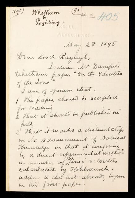 John Henry Poynting, Referee's report by John Henry Poynting, on a paper 'On the velocities of the ions' by William Cecil Dampier Whetham, 28 May 1895, RR/12/405, The Royal Society Archives, London, https://makingscience.royalsociety.org/items/rr_12_405/referees-report-by-john-henry-poynting-on-a-paper-on-the-velocities-of-the-ions-by-william-cecil-dampier-whetham, accessed on 09 February 2026