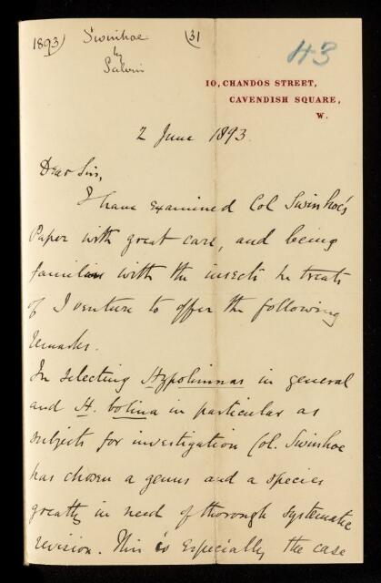 Osbert Salvin, Referee's report by Osbert Salvin, on a paper 'On the mimetic forms of certain butterflies of the genus Hypolimnas' by C Swinhoe, 02 June 1893, RR/12/43, The Royal Society Archives, London, https://makingscience.royalsociety.org/items/rr_12_43/referees-report-by-osbert-salvin-on-a-paper-on-the-mimetic-forms-of-certain-butterflies-of-the-genus-hypolimnas-by-c-swinhoe, accessed on 19 January 2026