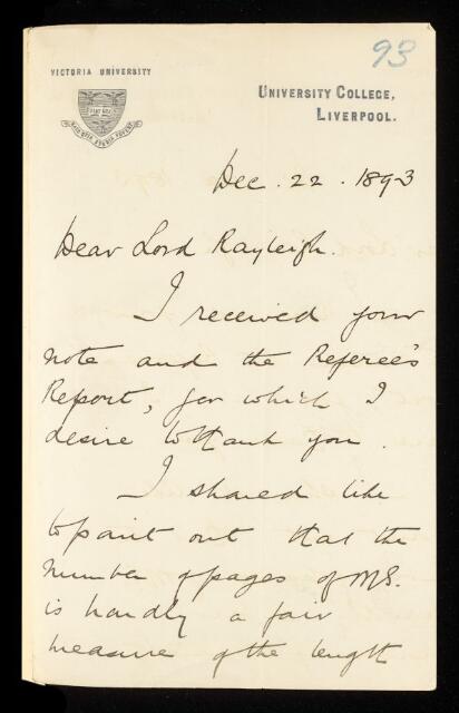 Letter from Stanley Dunkerley, to John William Strutt, Lord Rayleigh, regarding a paper 'On the whirling and vibration of shafts' by Stanley Dunkerley, 22 December 1893, RR/12/93, The Royal Society Archives, London, https://makingscience.royalsociety.org/items/rr_12_93/letter-from-stanley-dunkerley-to-john-william-strutt-lord-rayleigh-regarding-a-paper-on-the-whirling-and-vibration-of-shafts-by-stanley-dunkerley, accessed on 13 January 2026