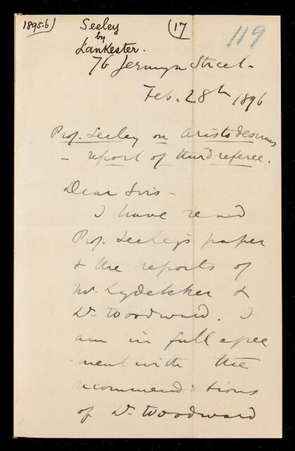 Edwin Ray Lankester, Referee's report by Edwin Ray Lankester, on a paper 'Researches on the structure, organisation, and classification of the fossil reptilia. Part X. On the complete skeleton of an anomodont reptile (Aristodesmus Rütimeyeri, Wiedersheim), from the bunter sandstone of reihen, near basel, giving new evidence of the relation of the anomodontia to the monotremata' by Harry Govier Seeley, 28 February 1896, RR/13/119, The Royal Society Archives, London, https://makingscience.royalsociety.org/items/rr_13_119/referees-report-by-edwin-ray-lankester-on-a-paper-researches-on-the-structure-organisation-and-classification-of-the-fossil-reptilia-part-x-on-the-complete-skeleton-of-an-anomodont-reptile-aristodesmus-rütimeyeri-wiedersheim-from-the-bunter-sandstone-of-reihen-near-basel-giving-new-evidence-of-the-relation-of-the-anomodontia-to-the-monotremata-by-harry-govier-seeley, accessed on 18 April 2026