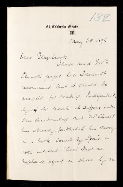 Thomas Edward Thorpe, Referee's report by Thomas Edward Thorpe, on a paper 'Colliery explosions produced by gas derived from coal dust' by Stuart, 28 May 1896, RR/13/132, The Royal Society Archives, London, https://makingscience.royalsociety.org/items/rr_13_132/referees-report-by-thomas-edward-thorpe-on-a-paper-colliery-explosions-produced-by-gas-derived-from-coal-dust-by-stuart, accessed on 18 April 2026