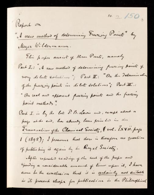 George Carey Foster, Referee's report by George Carey Foster, on a paper 'A new method of determining freezing points' by Meyer Wildermann, 15 July 1896, RR/13/150, The Royal Society Archives, London, https://makingscience.royalsociety.org/items/rr_13_150/referees-report-by-george-carey-foster-on-a-paper-a-new-method-of-determining-freezing-points-by-meyer-wildermann, accessed on 09 December 2025