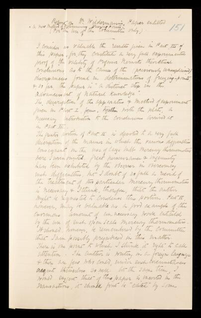 Ernest Howard Griffiths, Referee's report by Ernest Howard Griffiths, on a paper 'A new method of determining freezing points' by Meyer Wildermann, 1896, RR/13/151, The Royal Society Archives, London, https://makingscience.royalsociety.org/items/rr_13_151/referees-report-by-ernest-howard-griffiths-on-a-paper-a-new-method-of-determining-freezing-points-by-meyer-wildermann, accessed on 06 March 2026