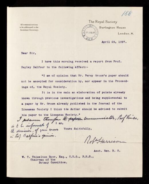 Letter from Robert Harrison, Assistant Secretary of the Royal Society, on a paper 'On the leaves of lathraea squamaria' by Percy Groom to William Turner Thiselton-Dyer, 29 April 1897, RR/13/188, The Royal Society Archives, London, https://makingscience.royalsociety.org/items/rr_13_188/letter-from-robert-harrison-assistant-secretary-of-the-royal-society-on-a-paper-on-the-leaves-of-lathraea-squamaria-by-percy-groom-to-william-turner-thiselton-dyer, accessed on 15 February 2026
