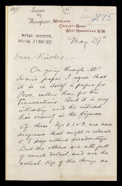 Silvanus Phillips Thompson, Referee's report by Silvanus Phillips Thompson, on a paper 'Stress and other effects produced in resin and in a viscid compound of resin and oil by electrification' by Joseph Wilson Swan, 29 May 1897, RR/13/275, The Royal Society Archives, London, https://makingscience.royalsociety.org/items/rr_13_275/referees-report-by-silvanus-phillips-thompson-on-a-paper-stress-and-other-effects-produced-in-resin-and-in-a-viscid-compound-of-resin-and-oil-by-electrification-by-joseph-wilson-swan, accessed on 16 February 2026