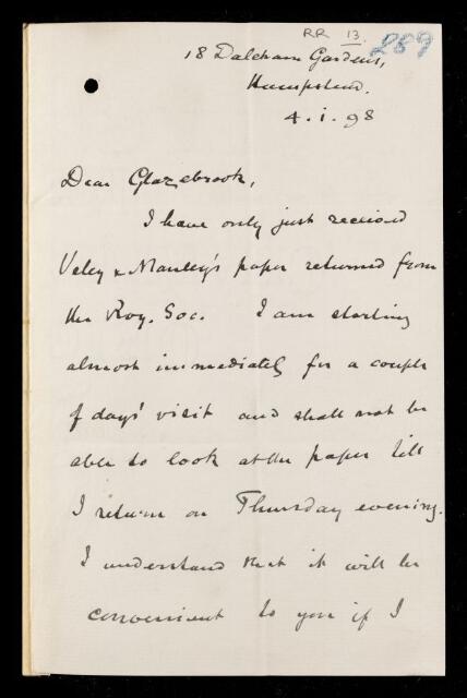 George Carey Foster, Letter from George Carey Foster, on a paper 'The electric conductivity of nitric acid' by Victor Herbert Veley and [John Job] Manley to Richard Tetley Glazebrook, 04 January 1898, RR/13/289, The Royal Society Archives, London, https://makingscience.royalsociety.org/items/rr_13_289/letter-from-george-carey-foster-on-a-paper-the-electric-conductivity-of-nitric-acid-by-victor-herbert-veley-and-john-job-manley-to-richard-tetley-glazebrook, accessed on 12 November 2025