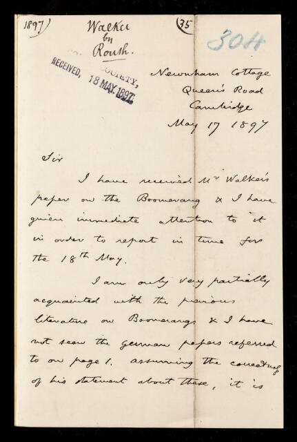 Edward John Routh, Referee's report by Edward John Routh, on a paper 'On boomerangs' by Gilbert Thomas Walker, 17 May 1897, RR/13/304, The Royal Society Archives, London, https://makingscience.royalsociety.org/items/rr_13_304/referees-report-by-edward-john-routh-on-a-paper-on-boomerangs-by-gilbert-thomas-walker, accessed on 08 December 2025