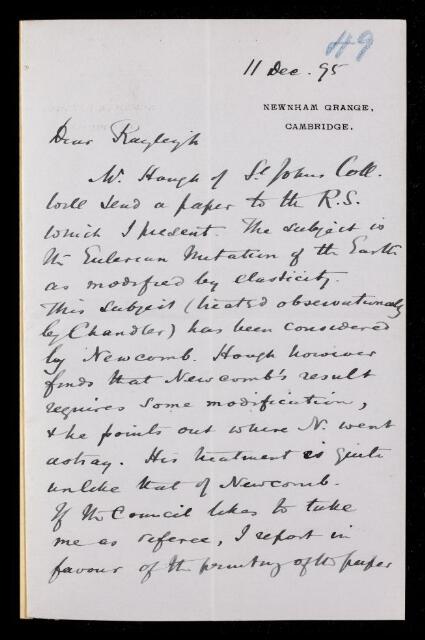 Letter from George Howard Darwin, on a paper 'The rotation of an elastic spheroid' by Sydney Samuel Hough to the Secretary of the Royal Society, 11 December 1895, RR/13/49, The Royal Society Archives, London, https://makingscience.royalsociety.org/items/rr_13_49/letter-from-george-howard-darwin-on-a-paper-the-rotation-of-an-elastic-spheroid-by-sydney-samuel-hough-to-the-secretary-of-the-royal-society, accessed on 13 January 2026