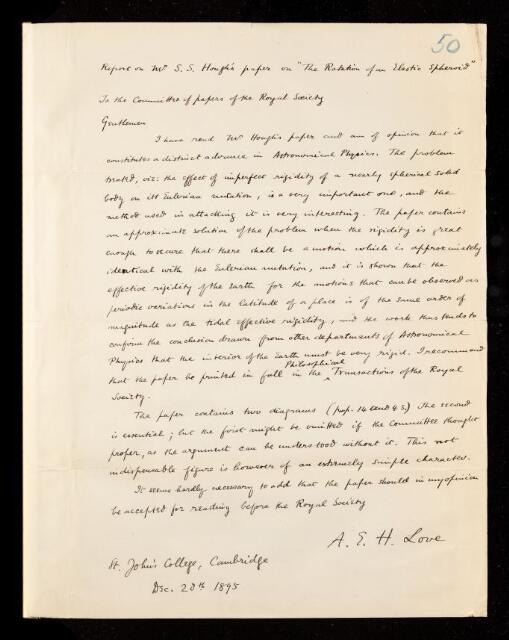 Augustus Edward Hough Love, Referee's report by Augustus Edward Hough Love, on a paper 'The rotation of an elastic spheroid' by Sydney Samuel Hough, 20 December 1895, RR/13/50, The Royal Society Archives, London, https://makingscience.royalsociety.org/items/rr_13_50/referees-report-by-augustus-edward-hough-love-on-a-paper-the-rotation-of-an-elastic-spheroid-by-sydney-samuel-hough, accessed on 25 January 2026