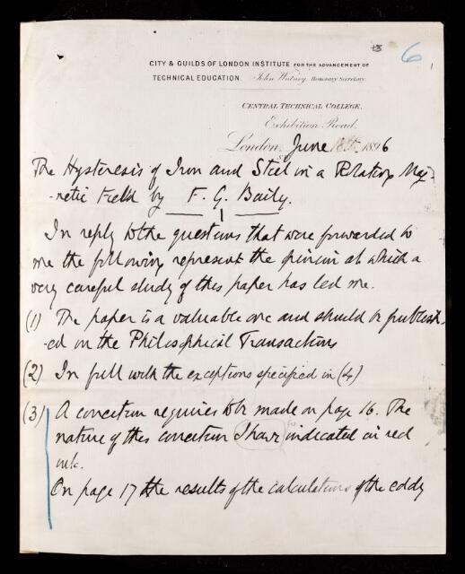 William Edward Ayrton, Referee's report by William Edward Ayrton, on a paper 'The hysteresis of iron and steel in a rotating magnetic field' by Francis Gibson Baily, 18 June 1896, RR/13/6, The Royal Society Archives, London, https://makingscience.royalsociety.org/items/rr_13_6/referees-report-by-william-edward-ayrton-on-a-paper-the-hysteresis-of-iron-and-steel-in-a-rotating-magnetic-field-by-francis-gibson-baily, accessed on 12 November 2025
