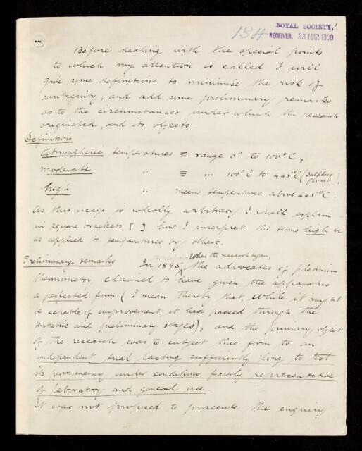 Letter from Charles Chree, regarding a paper 'Investigations on platinum thermometry at Kew Observatory' by Charles Chree, 12 March 1900, RR/14/134, The Royal Society Archives, London, https://makingscience.royalsociety.org/items/rr_14_134/letter-from-charles-chree-regarding-a-paper-investigations-on-platinum-thermometry-at-kew-observatory-by-charles-chree, accessed on 10 December 2025