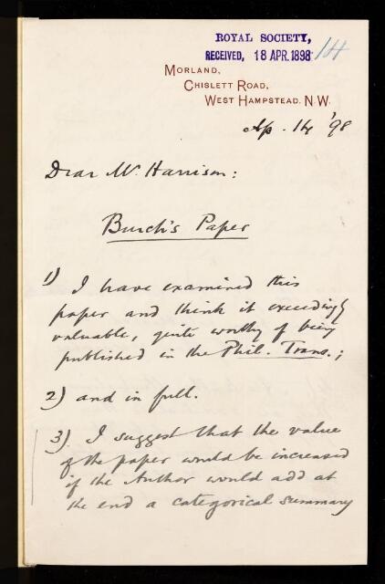 Silvanus Phillips Thompson, Referee's report by Silvanus Phillips Thompson, on a paper 'On artificial temporary colour-blindness, with an examination of the colour sensations of 109 persons' by George James Burch, 14 April 1898, RR/14/14, The Royal Society Archives, London, https://makingscience.royalsociety.org/items/rr_14_14/referees-report-by-silvanus-phillips-thompson-on-a-paper-on-artificial-temporary-colour-blindness-with-an-examination-of-the-colour-sensations-of-109-persons-by-george-james-burch, accessed on 16 February 2026