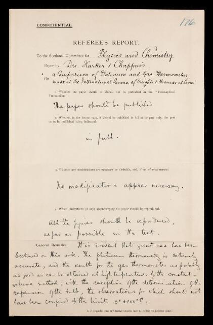 Hugh Longbourne Callendar, Referee's report by Hugh Longbourne Callendar, on a paper 'A comparison of platinum and gas thermometers, including a determination of the boiling-point of sulphur on the nitrogen scale. An account of experiments made in the laboratory of the Bureau International des Poids et Mesures Sèvres' by John Allen Harker and Pierre Chappuis, July 1899, RR/14/176, The Royal Society Archives, London, https://makingscience.royalsociety.org/items/rr_14_176/referees-report-by-hugh-longbourne-callendar-on-a-paper-a-comparison-of-platinum-and-gas-thermometers-including-a-determination-of-the-boiling-point-of-sulphur-on-the-nitrogen-scale-an-account-of-experiments-made-in-the-laboratory-of-the-bureau-international-des-poids-et-mesures-sèvres-by-john-allen-harker-and-pierre-chappuis, accessed on 12 December 2025