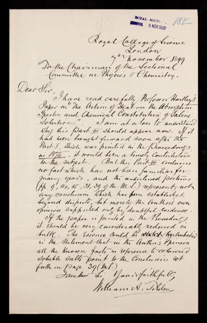 William Augustus Tilden, Referee's report by William Augustus Tilden, on a paper 'On the action of heat on the absorption-spectra an chemical constitution of saline substances. Part III' by Walter Noel Hartley, 07 November 1899, RR/14/182, The Royal Society Archives, London, https://makingscience.royalsociety.org/items/rr_14_182/referees-report-by-william-augustus-tilden-on-a-paper-on-the-action-of-heat-on-the-absorption-spectra-an-chemical-constitution-of-saline-substances-part-iii-by-walter-noel-hartley, accessed on 15 February 2026