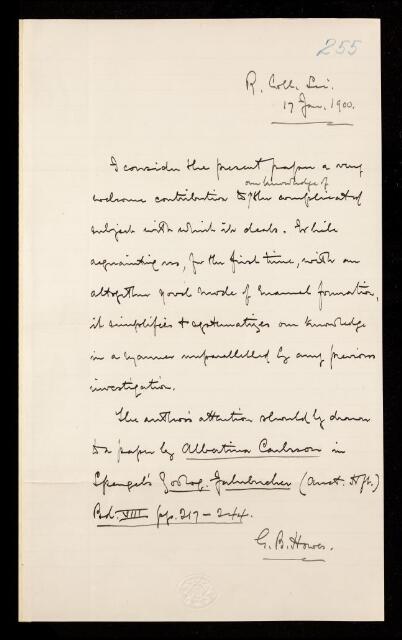 Thomas George Bond Howes, Detailed referee's report by Thomas George Bond Howes, on a paper 'Upon the development of the enamel in certain osseous fish' by Charles Sissmore Tomes, 17 January 1900, RR/14/255, The Royal Society Archives, London, https://makingscience.royalsociety.org/items/rr_14_255/detailed-referees-report-by-thomas-george-bond-howes-on-a-paper-upon-the-development-of-the-enamel-in-certain-osseous-fish-by-charles-sissmore-tomes, accessed on 24 January 2026