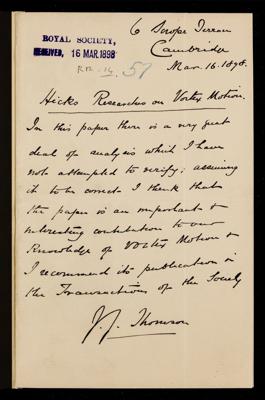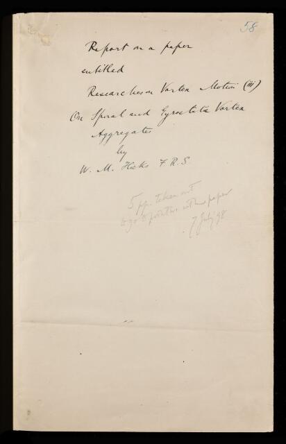 Micaiah John Muller Hill, Referee's report by Micaiah John Muller Hill, on a paper 'Researches in vortex motion.—Part III. On spiral or gyrostatic vortex aggregates' by William Mitchinson Hicks, 1898, RR/14/58, The Royal Society Archives, London, https://makingscience.royalsociety.org/items/rr_14_58/referees-report-by-micaiah-john-muller-hill-on-a-paper-researches-in-vortex-motionpart-iii-on-spiral-or-gyrostatic-vortex-aggregates-by-william-mitchinson-hicks, accessed on 11 March 2026