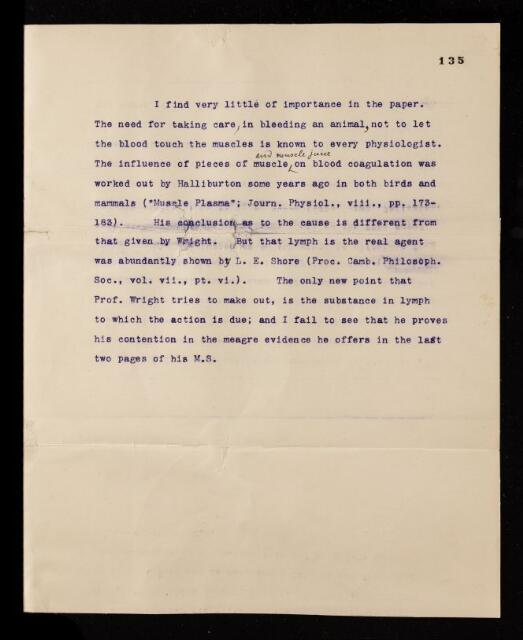 There is very little of importance in the paper. The need for taking care not to let the blood of a bleeding animal touch the muscle is known to every physiologist. The influence of pieces of muscle and 'muscle juice' on blood coagulation was worked out some years ago in both birds and mammals, see 'Muscle Plasma' in the 'Journal of Physiology', VIII, pages 173-183. His conclusion is different to that given by the author. That lymph is the real agent was abundantly shown by L E Shore, 'Proceedings of the Cambridge Philosophical Society', volume VII, part VI. The only new point that the author tries to make out is the substance in lymph to which the action is due, and he fails to see that the author proves his contention in the 'meagre evidence' offered in the last two pages of his manuscript.